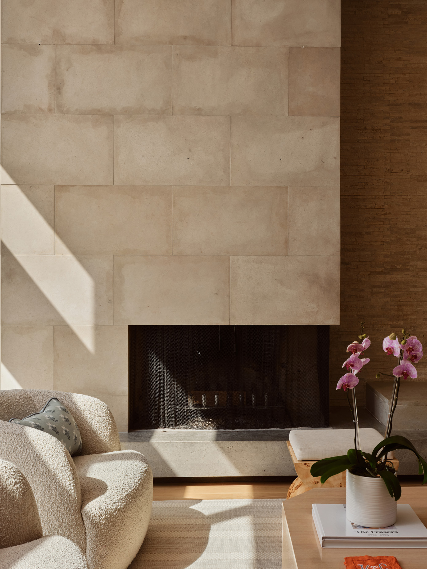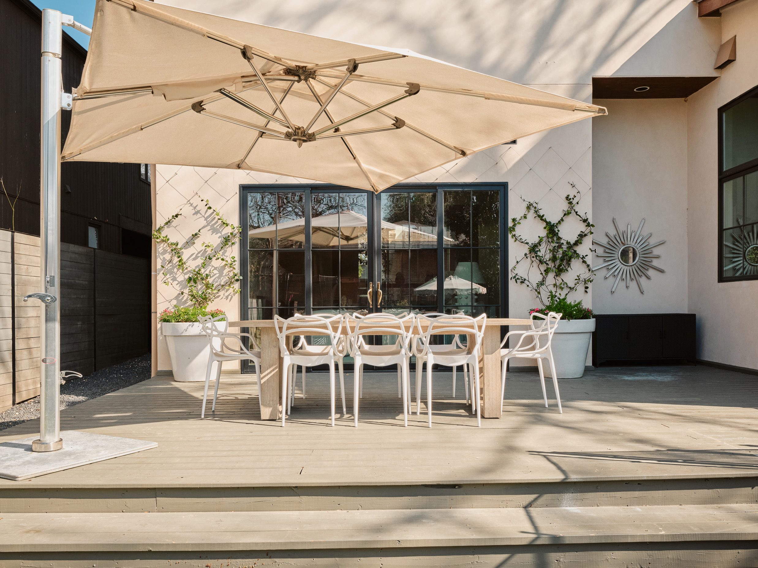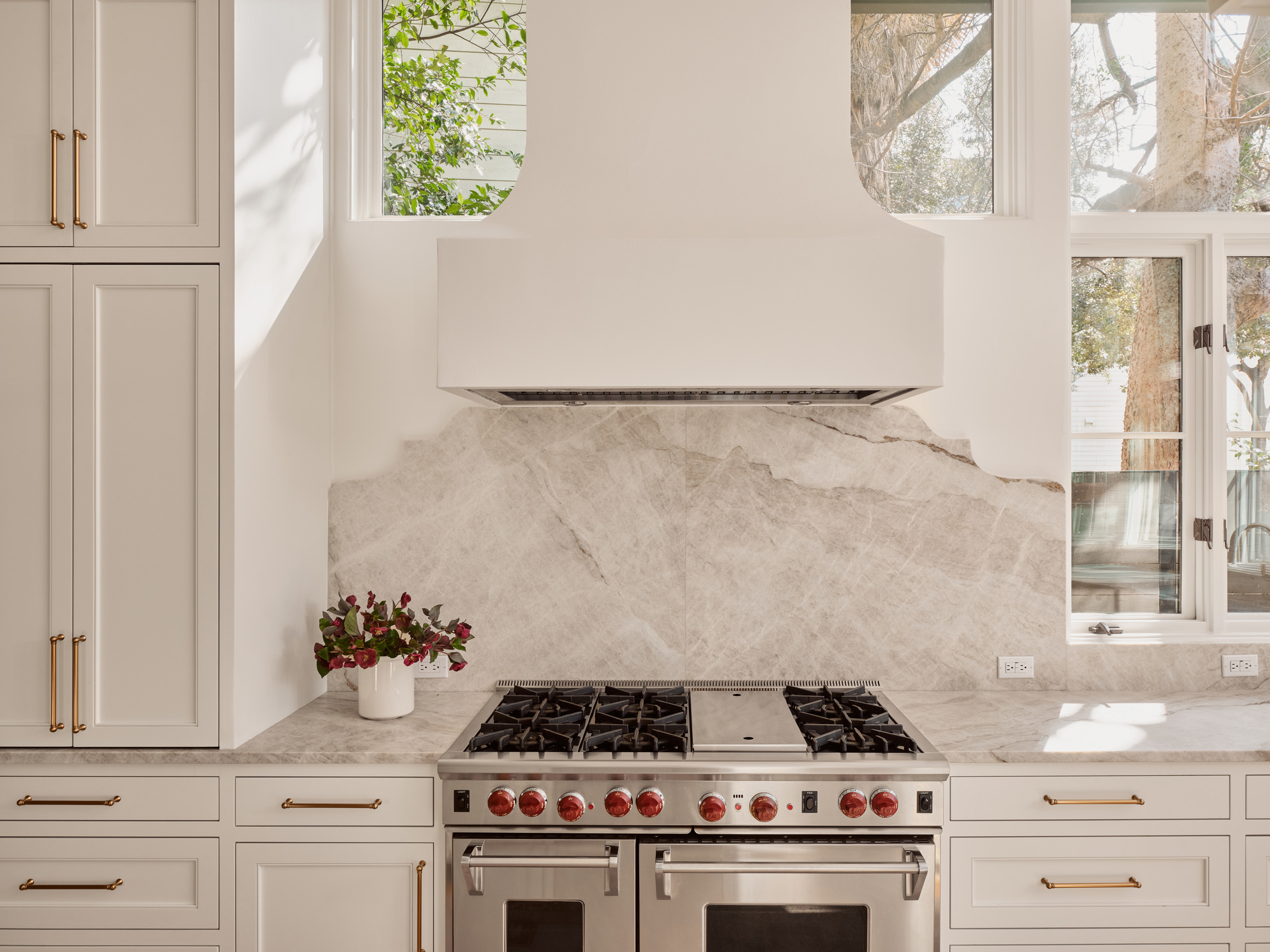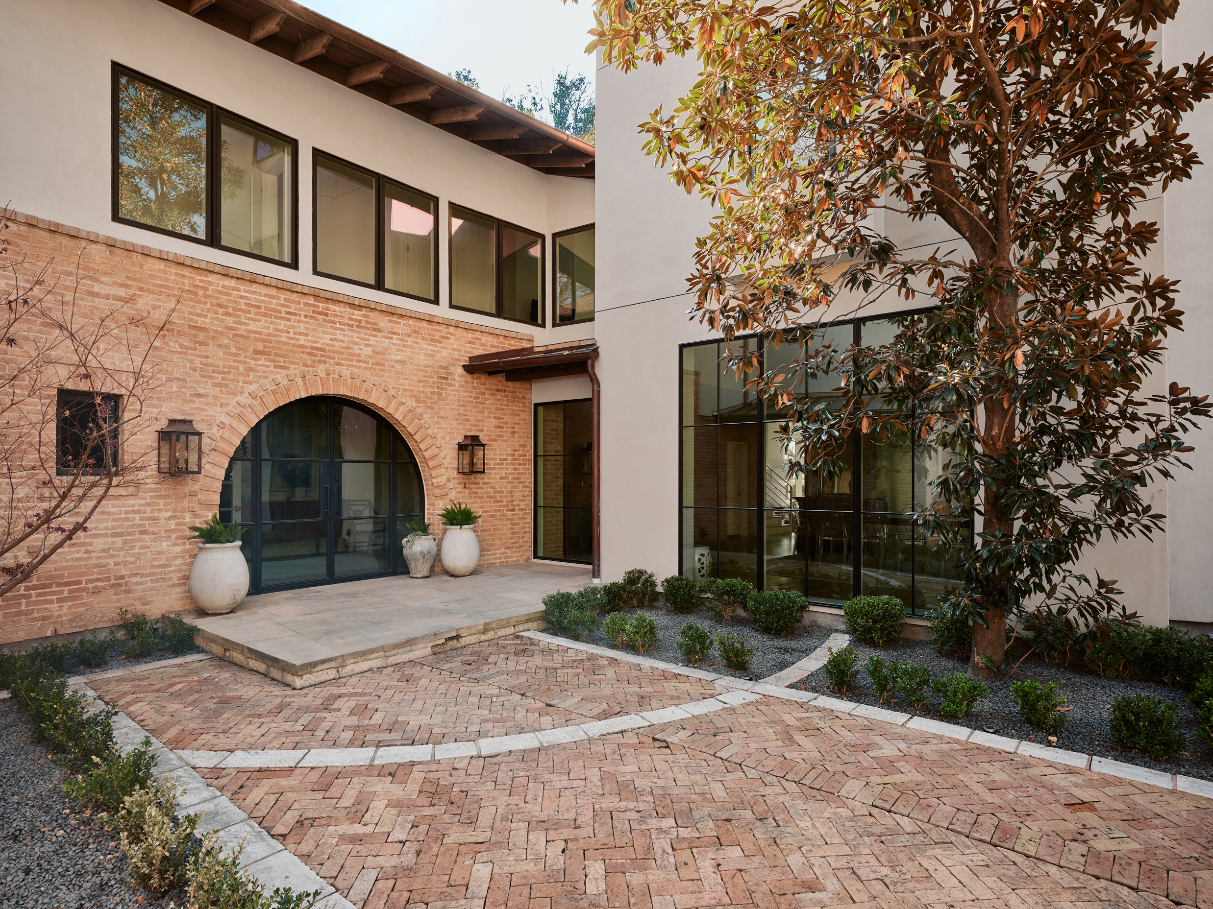 Rich in texture, warmth, and character, the home is equally open, light-filled, and beautifully functional. Expansive windows flood the interiors with natural light, highlighting gorgeous wood floors, exposed interior brick, and designer finishes throughout. An arched steel-and-glass front door makes a striking first impression, setting the tone for the refined details found within.
