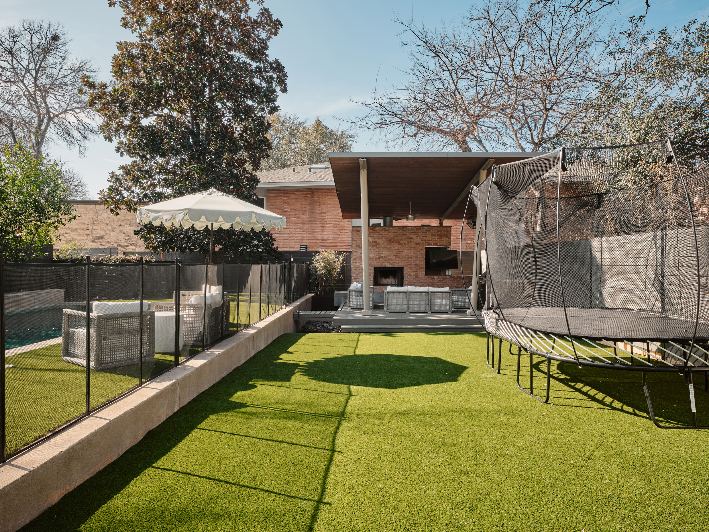 Outdoor living is equally impressive. Just off the kitchen and main living area, a spacious deck invites dining al fresco under the Texas sky. The turfed backyard ensures low-maintenance beauty year-round, while the resort-style pool with integrated hot tub offers a private oasis. A covered patio with fireplace and dedicated grilling area completes the outdoor experience—perfect for year-round entertaining.