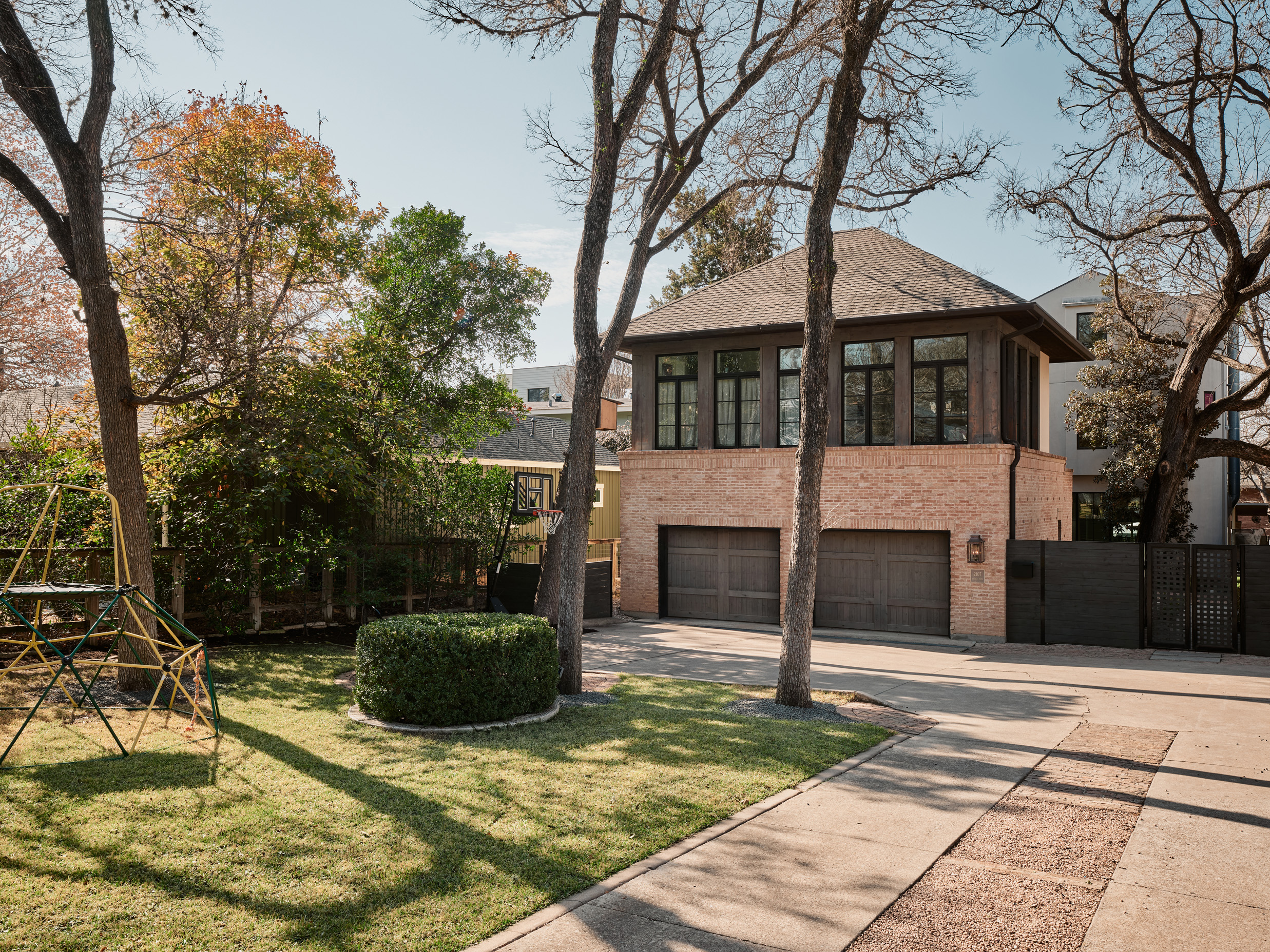 Rich in texture, warmth, and character, the home is equally open, light-filled, and beautifully functional. Expansive windows flood the interiors with natural light, highlighting gorgeous wood floors, exposed interior brick, and designer finishes throughout. An arched steel-and-glass front door makes a striking first impression, setting the tone for the refined details found within.